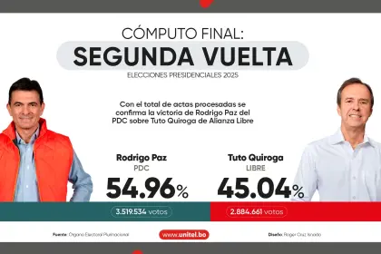 Los resultados oficiales confirman la tendencia que había proyectado el Sistema de Resultados Electorales Preliminares (Sirepre) que el domingo había dado como vencedor a Rodrigo Paz del Partido Demócrata Cristiano (PDC) con el 54,61%.